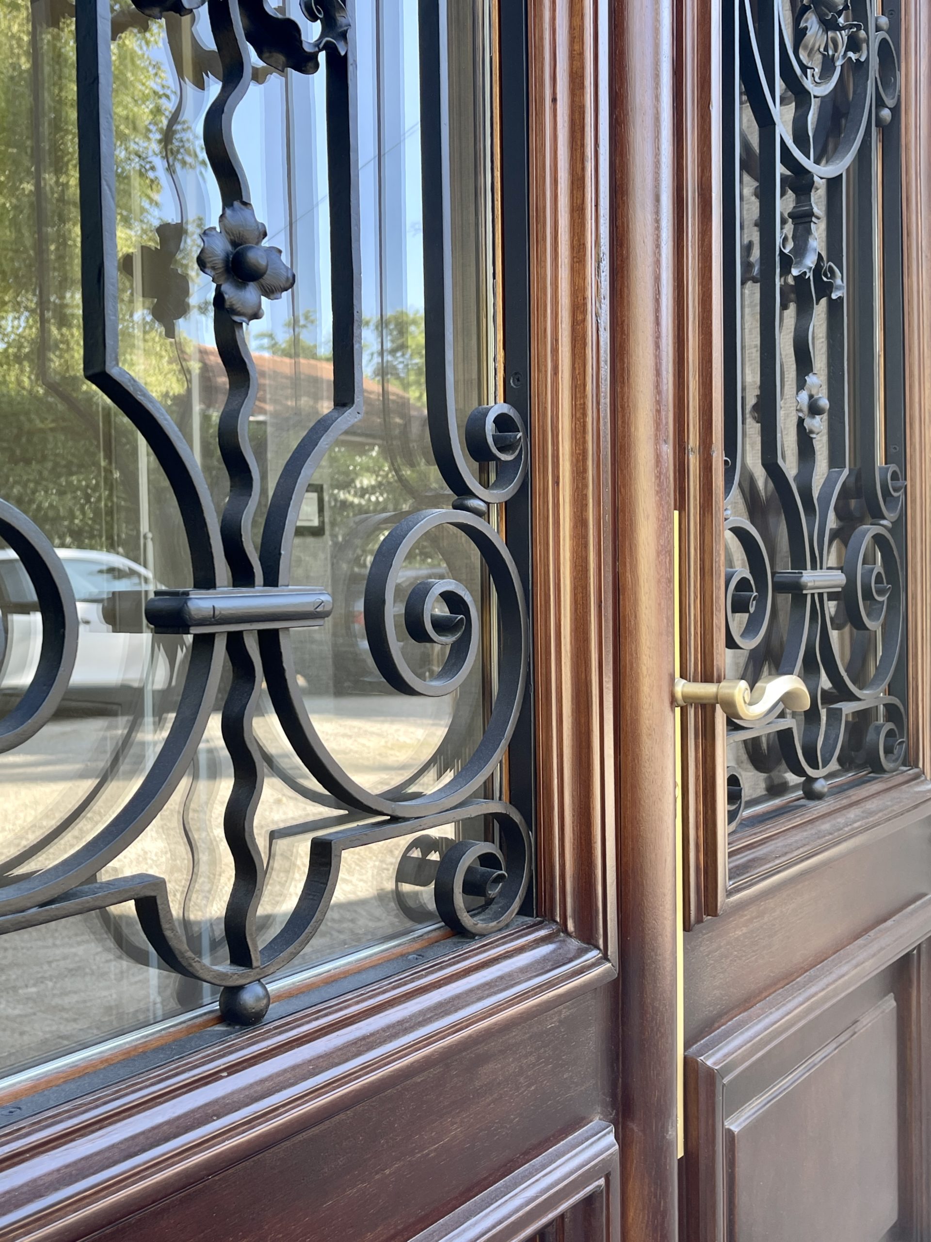 Un soin particulier a été apporté aux boiseries, certaines parties ayant été trop endommagées pour être conservées. Elles ont été reproduites à l’identique grâce à un travail artisanal précis, garantissant une continuité parfaite avec les matériaux d’origine. La ferronnerie, élément clé de cette porte, a également été retravaillée pour retrouver sa beauté et sa robustesse.